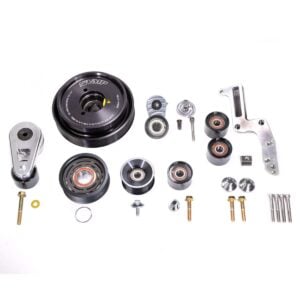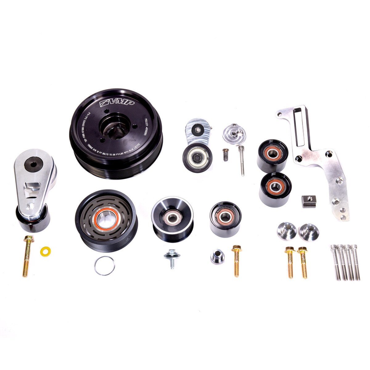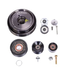 The kit uses VMP 10-rib pulleys. Â Note: pulleys smaller than 2.7″ or 2.9″ in Griptec require machining of the front edge of the supercharger cartridge to clear.